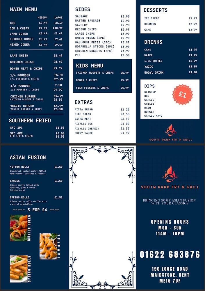 South Park Fry N Grill is nestled at 190 Loose Rd in Maidstone, Kent, a prime location that welcomes both locals and visitors alike. This inviting restaurant combines traditional British fare with Asian-inspired dishes, creating a unique dining experience. The casual vibe resonates through its decor and lively atmosphere, especially when live music fills the air on weekend evenings. Customers relish a mix of dine-in and takeout options, making it convenient for those in a rush or simply enjoying a laid-back meal with family.